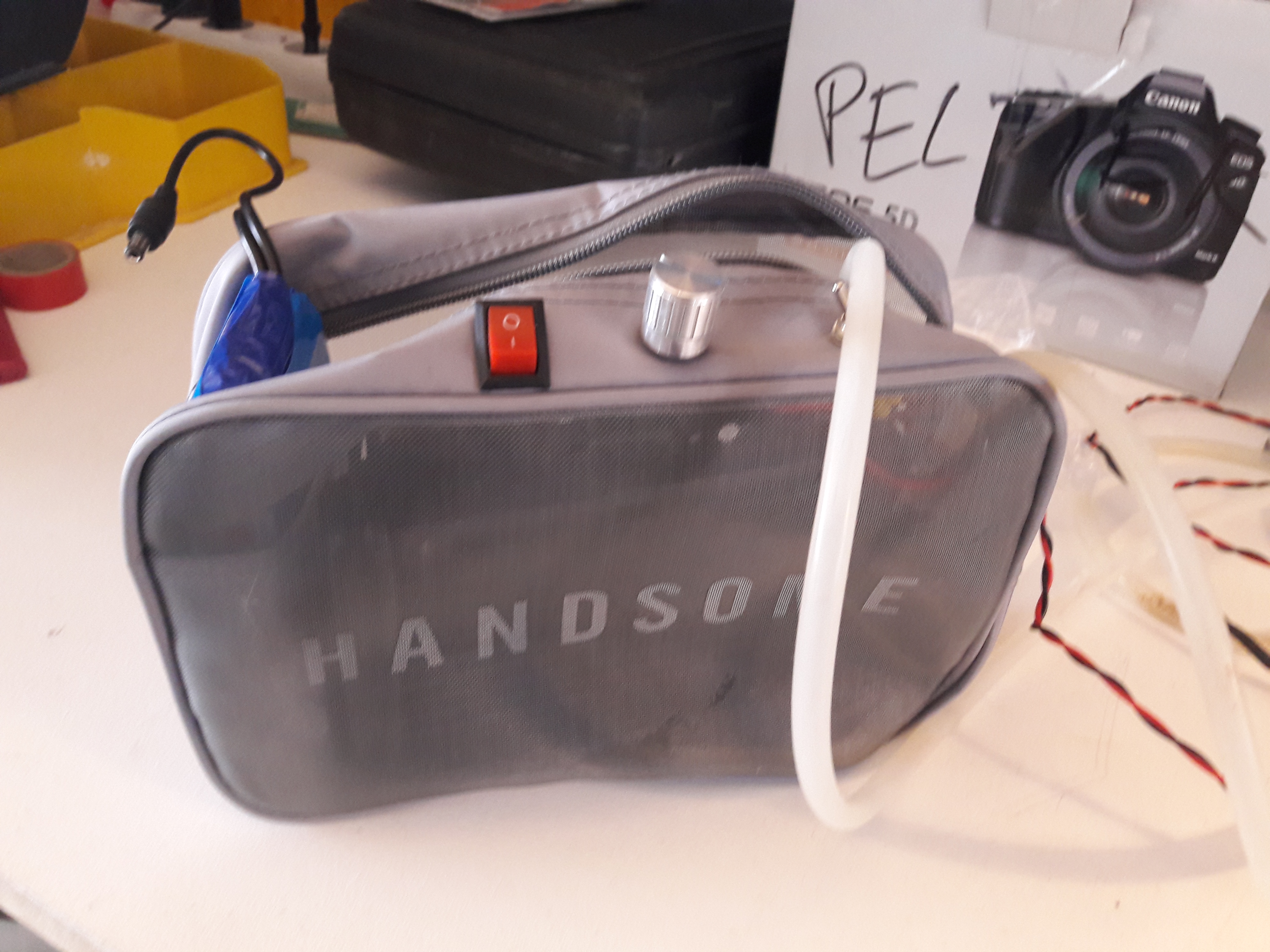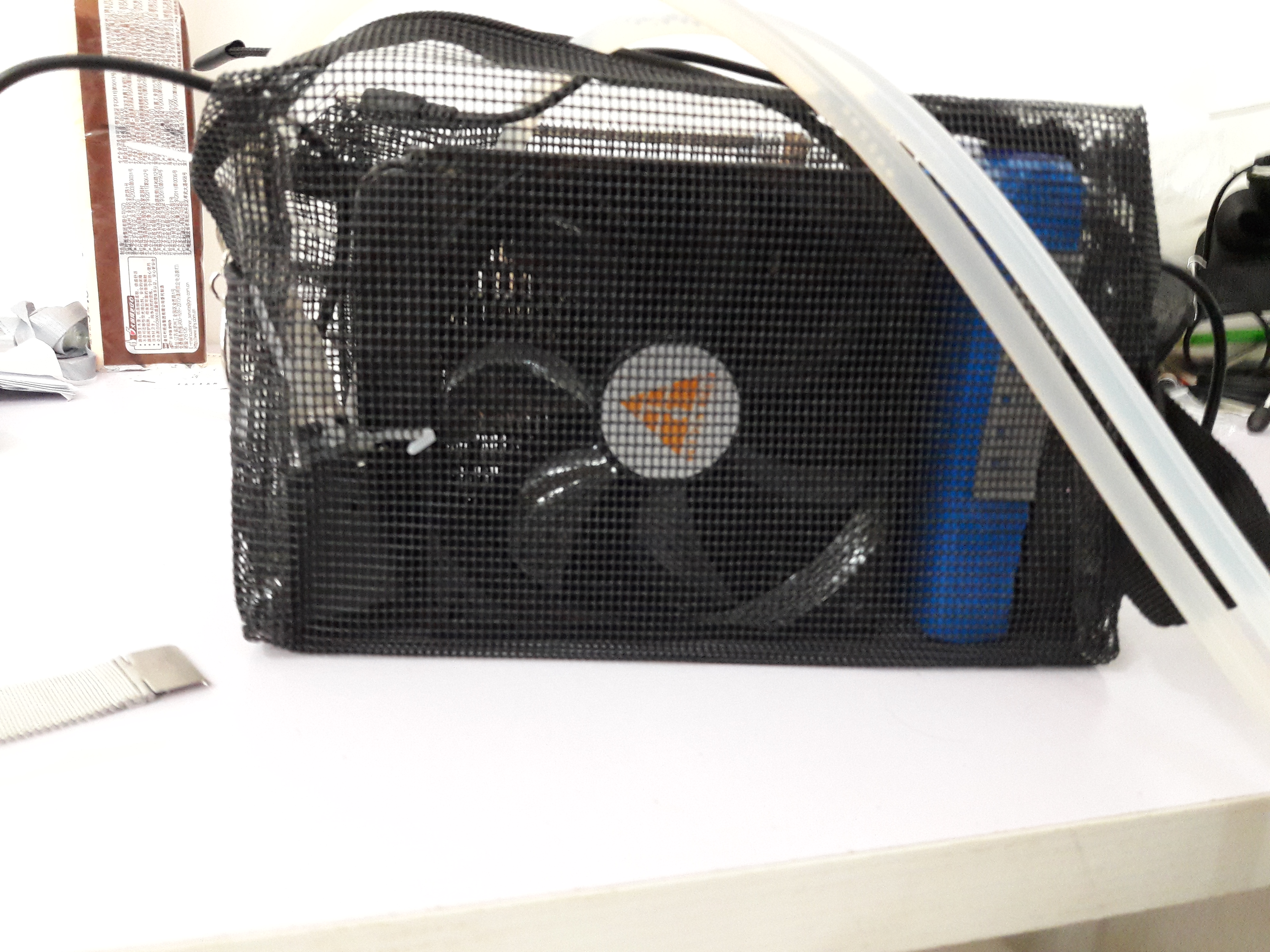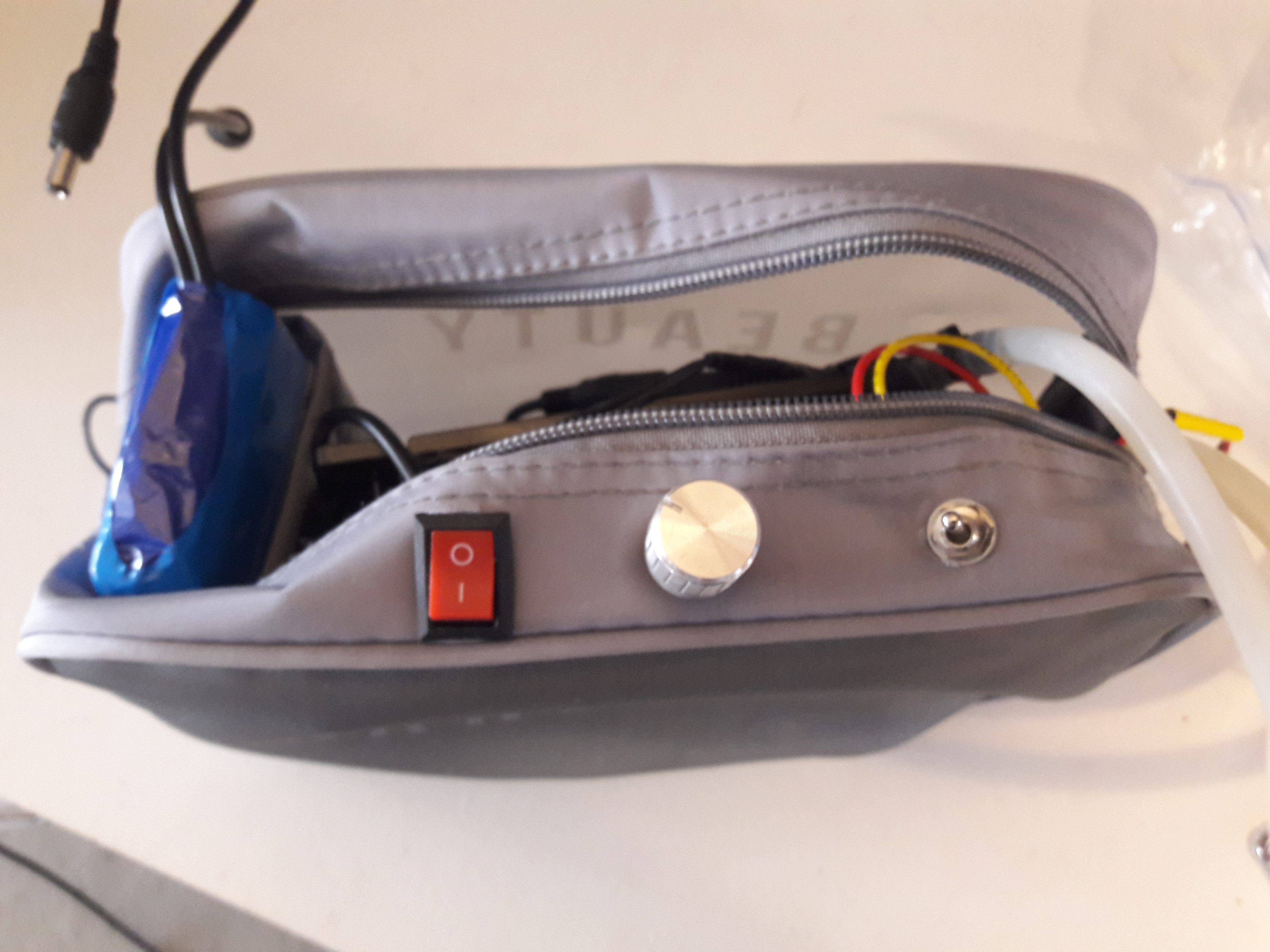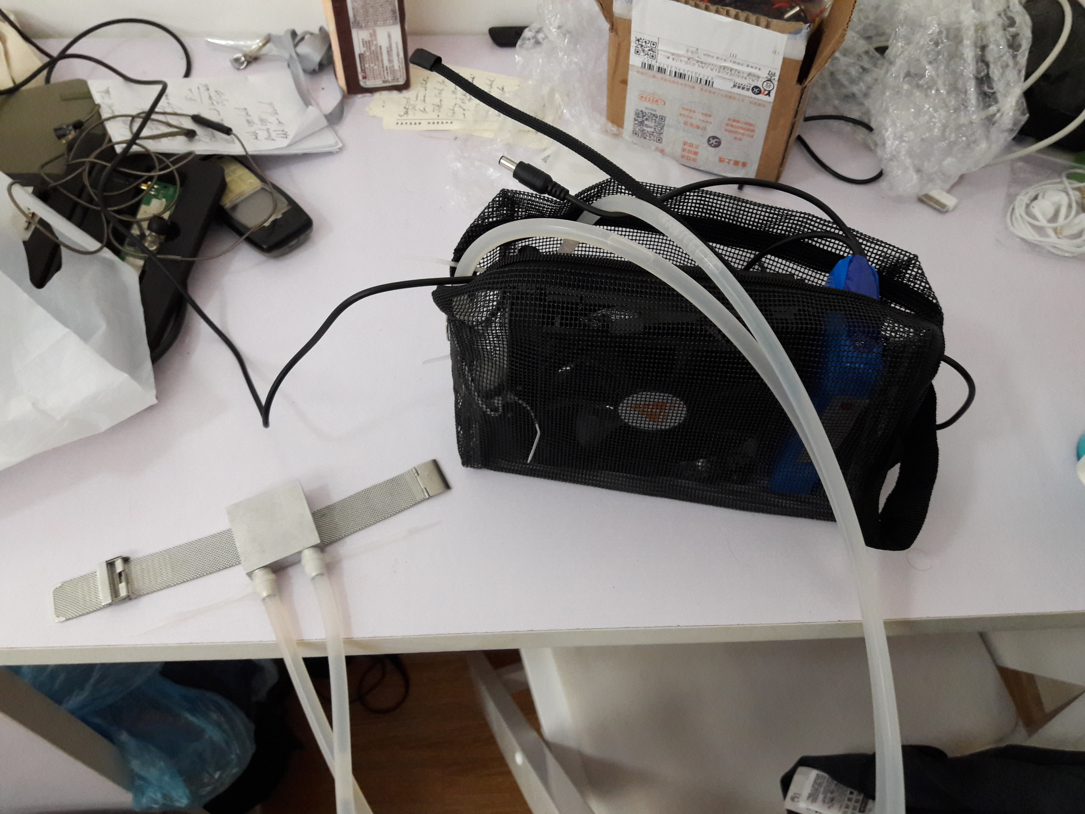 I bought some cheap PC water cooling equipment which included the necessary water pump, reservoir, tubing and heat exchanger. I also bought a few 40x40mm Peltier modules, a 12V battery, a PWM controller with a potentiometer, a switch, a wristband and some aluminium. I also bought a bathroom pouch, which looked sturdy but could let the air in, so that the heat exchanger would work properly.
