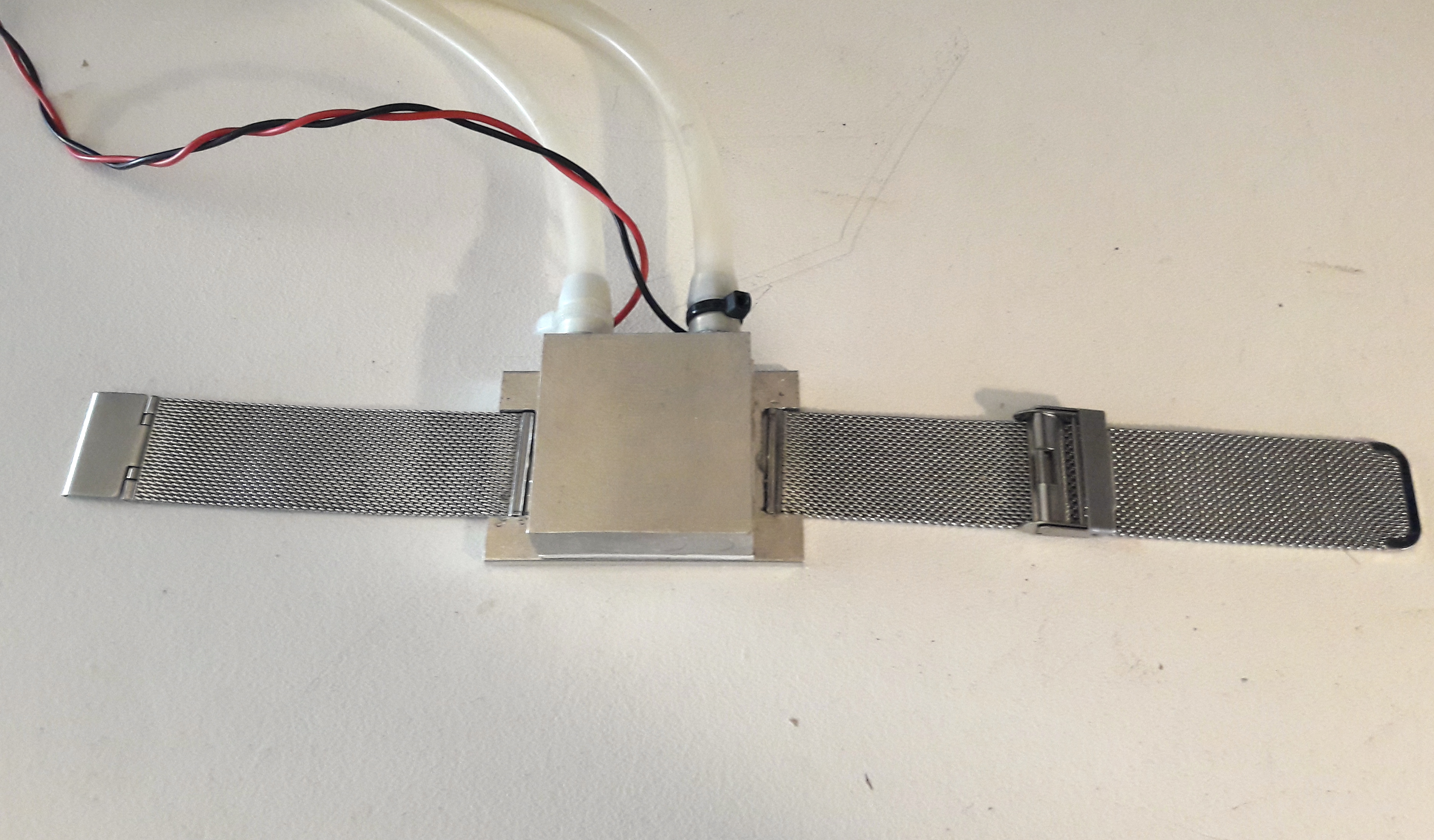 The idea was simple : make a sort of wristwatch with a Peltier module attached. This would draw the heat from the wrist, which would cool the body thanks to circulation of blood. However, there is a catch : the efficiency of Peltier modules is very low, and, besides, the heat extracted from the body (to reduce its temperature) has to be evacuated somehow : For 1W of heat extracted from the body, the Peltier will heat up by another 1W, which means the system has to evacuate 2W.